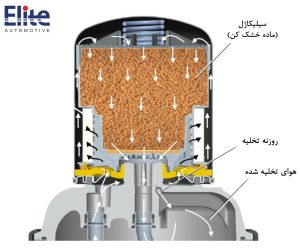 خشک کن هوا – Air Dryer حاوی گرانولهای ژل سیلیکا (سیلیکاژل) است، مادهای خشککننده که قادر به جذب بخار آب است.